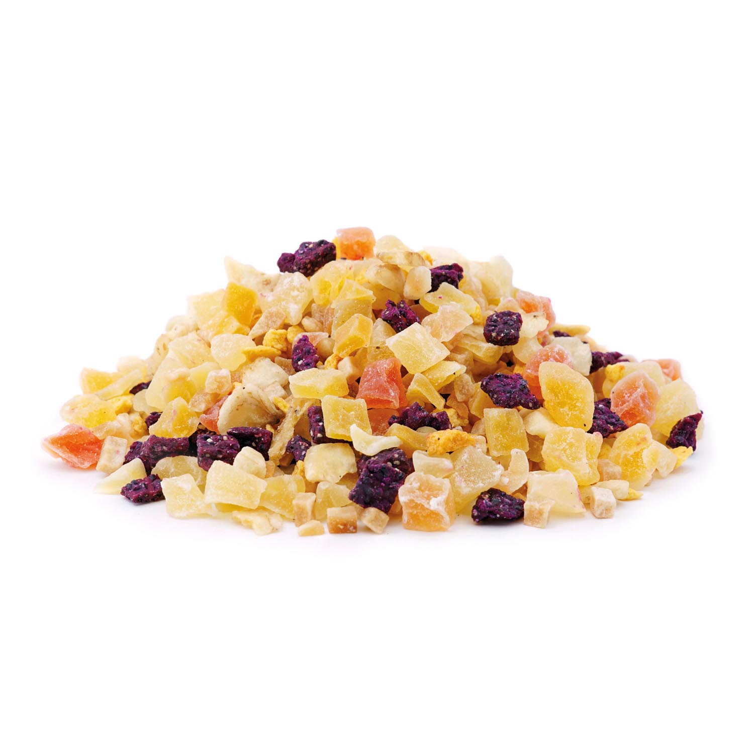 Zutaten: Drachenfruchtstücke, Mangostücke (Mango, Zucker, Säuerungsmittel: Zitronensäure), Ananasstücke (Ananas, Zucker, Säuerungsmittel: Zitronensäure), Papayastücke (Papaya, Zucker), Guavenstücke (Guave, Zucker), Bananenchips (Bananen, Kokosnussöl, Rohrzucker, natürliches Bananenaroma), Melonenstücke (Melone, Zucker, Säuerungsmittel: Zitronensäure), Aroma, Orangengranulat (Orangensaftkonzentrat, Orangenzellen), natürliches Aroma.