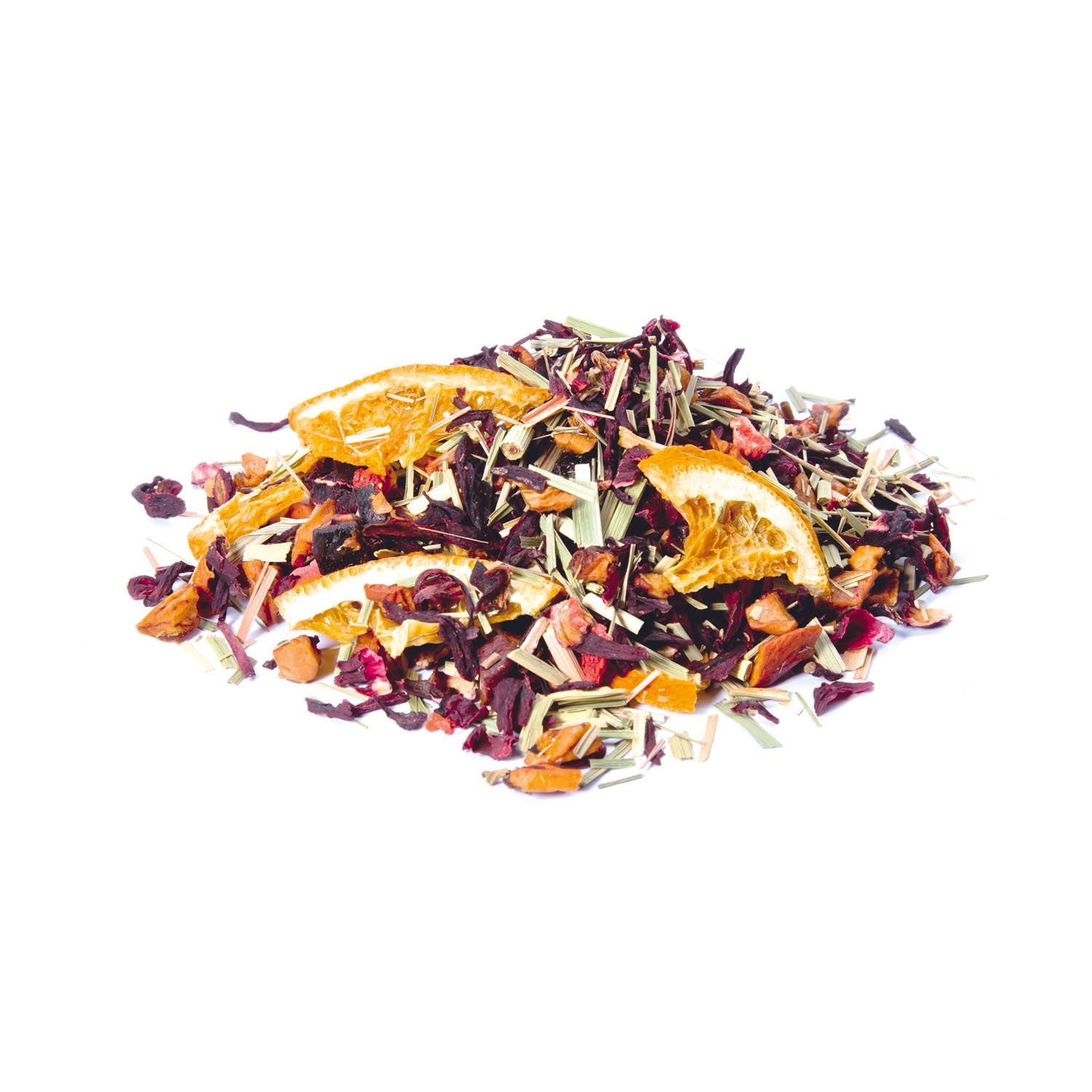 Zutaten: Apfelstücke, Hibiskusblüten, Zitronengras, Orangenecken (9%), natürliches Erdbeeren-Aroma, Erdbeerstücke (2%), natürliches Orangen-Aroma.
