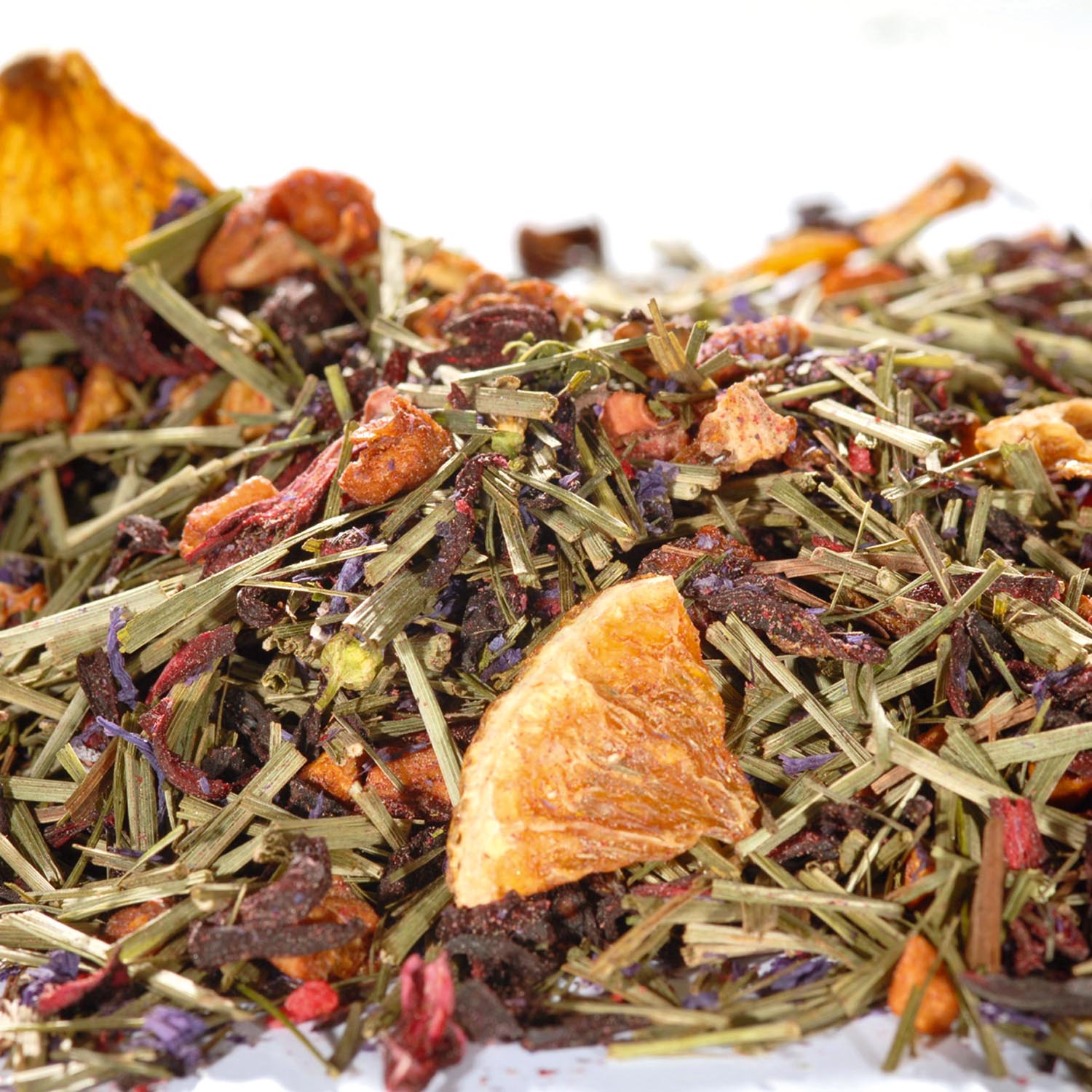 Zutaten: gesäuerte Apfelstücke (Äpfel, Säuerungsmittel: Citronensäure), Hibiskusblüten, Zitronengras, Orangenecken, Malvenblüten, Aroma, Himbeerstücke (2%).
